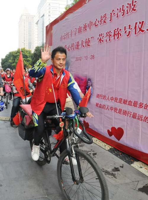 10月29日,被称作唐山“最美理发师”的冯波抵宁,与南京红十字血液中心50位志愿者一起骑行至新街口宣传无偿献血。在新街口万达广场的献血车旁,中心主任蔡旭兵为其颁发了“南京爱心传递大使”证书。据了解,冯波从去年开始用骑车的方式宣传无偿献血,足迹遍布全国30余城市,带动了近千人参与无偿献血。