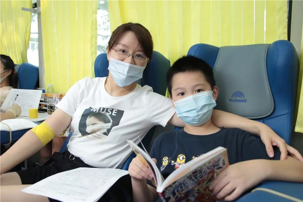 献血车上,一位依偎在妈妈身边看书的小男孩吸引了大家的注意。妈妈王弢是第一次献血,“孩子即将上小学四年级,带他一起来献血,就是为了让孩子零距离接触公益,打开他的眼界,体验、感悟、领会校园以外的社会,吸收更多正能量。也希望在他心里埋下一颗爱的种子,从小培养他奉献爱心的意识。”