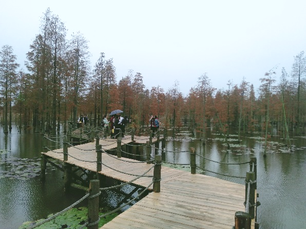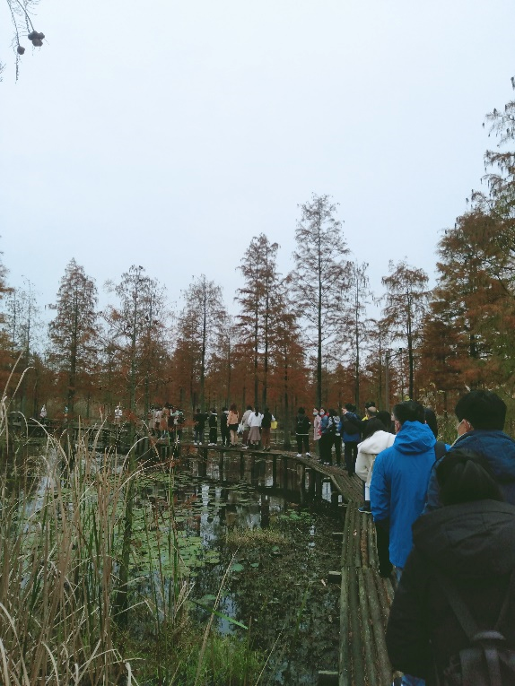池杉湖国家湿地公园位于安徽来安与江苏六合交界处,经过近四十年的发育演替和十多年的精心修复,现已形成分布池杉总数五万多棵、具有独特观赏价值的“水上森林”湿地景观,并成为长江下游沿江地区鸟类重要的集中栖居地。职工们一行漫步池杉栈道,置身林中深处,呼吸健康纯净空气,欣赏水中倒影婆娑,聆听林中鸟儿欢叫,大家放下了平时工作的紧张,多了一份亲近自然的恬静。
