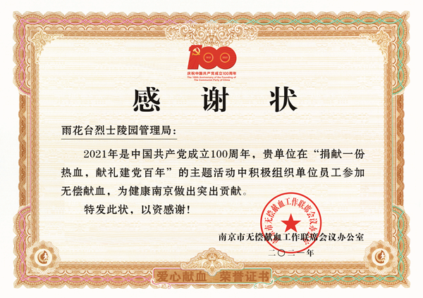 南京市雨花台烈士陵园管理局长期以来坚持参加无偿献血公益活动,特别是今年党史学习教育繁忙的时候,主动联系南京红十字血液中心,结合党史教育,开展无偿献血公益活动。