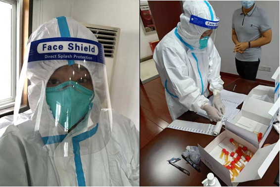与此同时,检验科标本交接组汪洋同志闻令而动,积极投身于全民核酸检测志愿服务。他参加的是核酸检测标本的前处理工作,在坐落于南京市汤泉街道的中润医学检验公司里,常常需要长时间身穿密不透风的防护服连续工作,汗水一遍遍浸湿了他的衣服和头发,但他从不叫苦喊累。他与所有的检测人员一起争分夺秒,与病毒赛跑,在特殊时期展现了“检验人的速度”,彰显了“血液中心人的担当”。