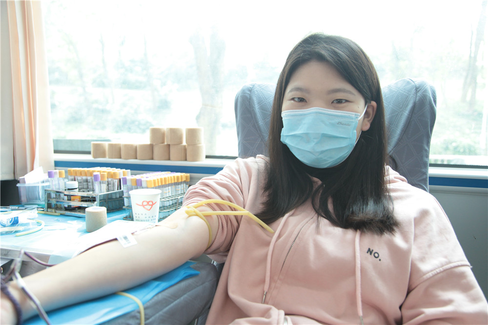 郑培培:第一次献血后感觉还不错,还做了志愿者,今天把宿舍姐妹都喊来一起献血。