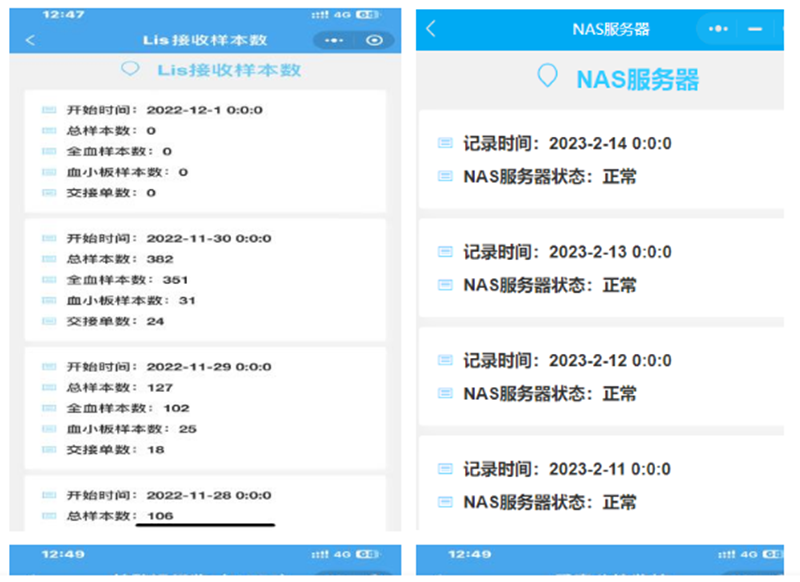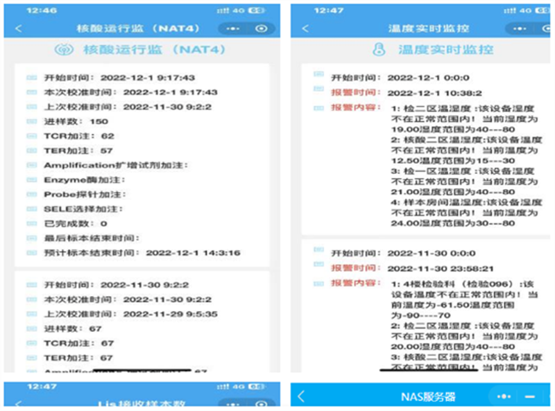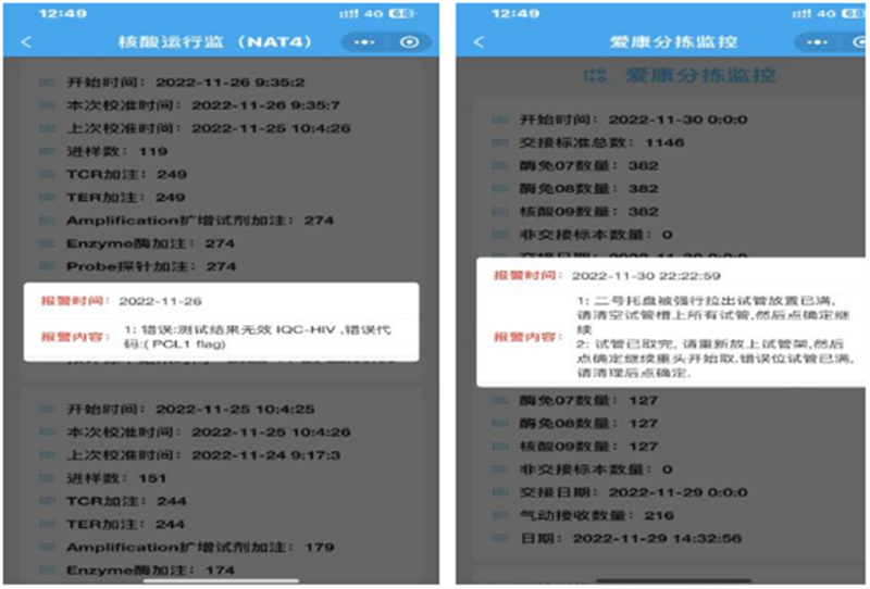 系统以无线传感器网络和云计算技术为基础,构建了一套包括设备运行及报警数据采集、传输、提醒和存储的移动医疗监控平台。工作人员可通过微信小程序实时监控设备运行情况,如核酸检测设备检试验进度及故障信息,冰箱温度报警、分拣设备工作情况。系统通过软件接口获取设备运行及报警信息,并进行预处理,然后将数据通过硬件防火墙和无线设备传输到云平台,在云端对这些数据进行存储和分析,并根据分析的结果通过远程端口加以推送,及时提醒工作人员设备运行报警,工作人员可以实时进行远程系统操控,对简单的设备故障进行排除,也可以上传数据到设备工程师端进行远程分析处理。