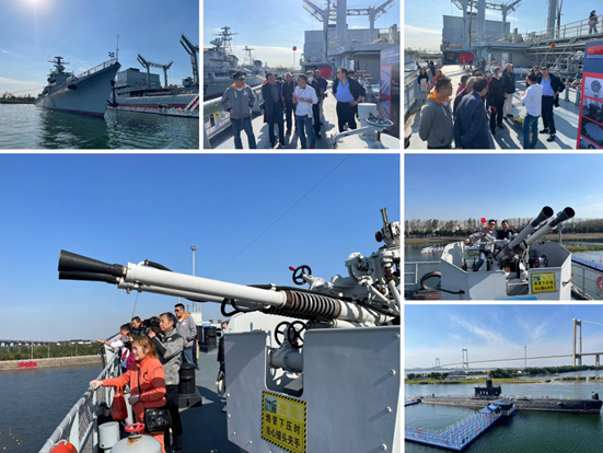 随后,老同志们又来到了气势恢宏的泰兴舰艇文化园。当退役的“三舰一艇”巍然屹立在眼前时,老同志们无不为之动容。这些曾驰骋万里海疆、捍卫国家主权的功勋舰艇,以其钢铁雄姿诉说着人民海军的壮阔征程。在讲解员的引导下,老同志们兴致勃勃地登上了战舰甲板,亲手触摸冰冷的炮管,驻足于复杂的舰桥设备前,仿佛听到了昔日远航的汽笛与波涛的轰鸣。一位曾有过军旅生涯的老同志激动地表示:“以前只在电视上看过军舰,今天能亲自上来走一走、看一看,感觉特别震撼!看到我们的国防力量如此强大,让我感到无比自豪和安心!”