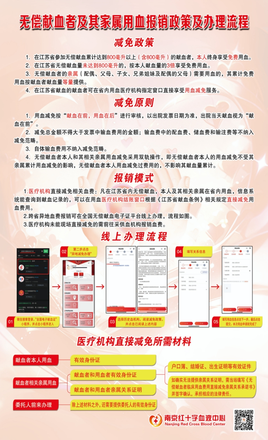 在此基础之上,根据《江苏省献血条例》、《省内异地用血报销通知》、《关于开展无偿献血者临床用血费用直接减免工作的通知》,无偿献血者本人和无偿献血者家属都可以享受用血费用报销政策,具体实施如下: